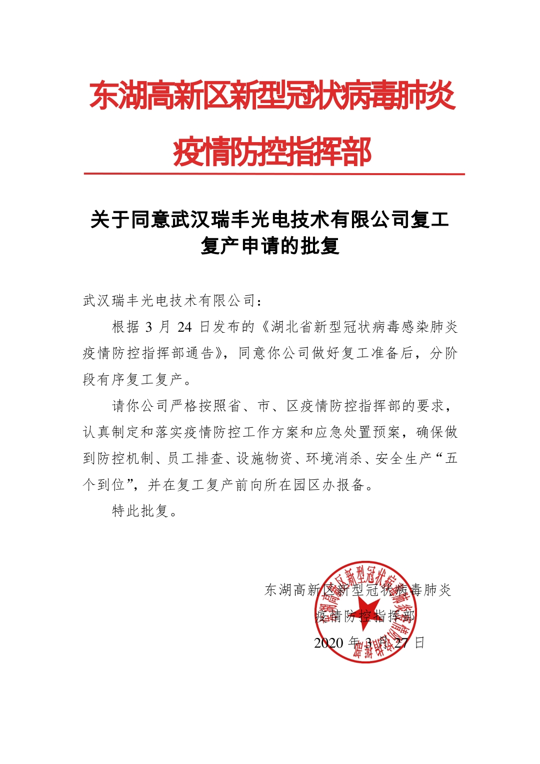在萬眾一心抗擊疫情的非常時期,堅(jiān)決貫徹黨中央重要決策部署,認(rèn)真落實(shí)省、市會議精神及上級工作要求,隨著新型冠狀病毒肺炎疫情防控工作的進(jìn)展,疫情的控制也逐漸走向明朗的方向, 武漢瑞豐光電技術(shù)有限公司也快速響應(yīng)防疫管控號召,在通過審批后,于2020年3月30日起正式復(fù)工。
